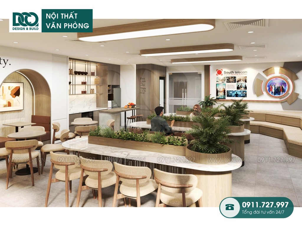 Tổng thể, thiết kế không gian làm việc kết hợp cafe tại tầng 8 South Telecom thể hiện tư duy lấy con người làm trung tâm. Không gian không chỉ đáp ứng đầy đủ nhu cầu công năng mà còn góp phần kiến tạo một môi trường làm việc cởi mở, linh hoạt và giàu tính kết nối – nền tảng quan trọng cho một văn hóa doanh nghiệp hiện đại và năng động.