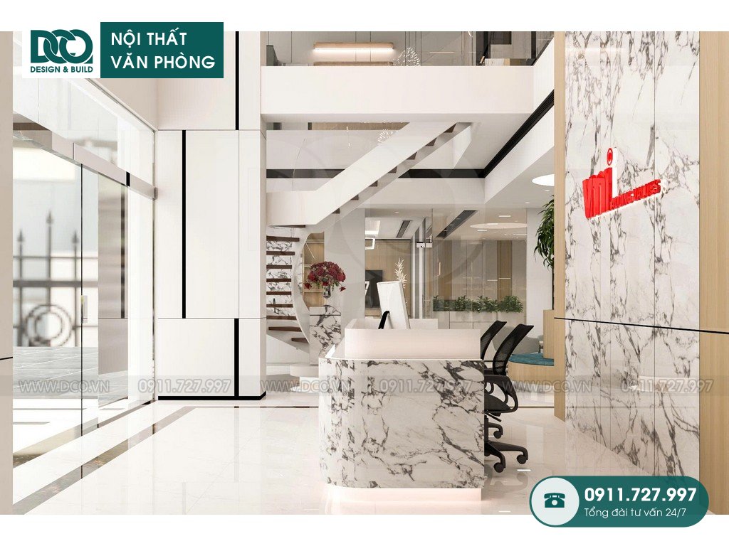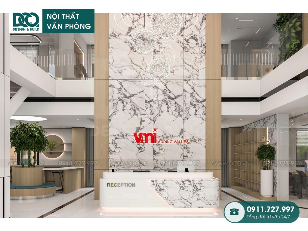 Tầng 1, với diện tích 270m², được thiết kế như "bộ mặt thương hiệu" của toàn văn phòng, bao gồm không gian lễ tân – chờ – trưng bày. Điểm nhấn ấn tượng là mảng tường đá marble cao tầng in vân tự nhiên, cùng logo VMI trung tâm, tạo nên ấn tượng vững chãi và chuyên nghiệp ngay từ khoảnh khắc đầu tiên. Quầy lễ tân được bo cong nhẹ nhàng giúp giảm bớt vẻ khô cứng thường thấy ở các văn phòng trong khu công nghiệp, mang lại cảm giác gần gũi và thân thiện. Khu vực chờ đợi và trưng bày được bố trí liên hoàn, tạo cơ hội để doanh nghiệp giới thiệu năng lực, sản phẩm và hành trình phát triển một cách trực quan, sinh động hơn lời nói.